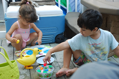 And then we had a 'Mia Day' as Jayden calls it! She stays with us while her Mom is at work, and Jayden always looks forward to the days when Mia comes! It was very hot and they wanted to go play in the sand box, but I convinced them to play with water instead, well, it didn't take much convincing, they were eager, so I got them changed into their bathing suits and we went outside on the little side deck.